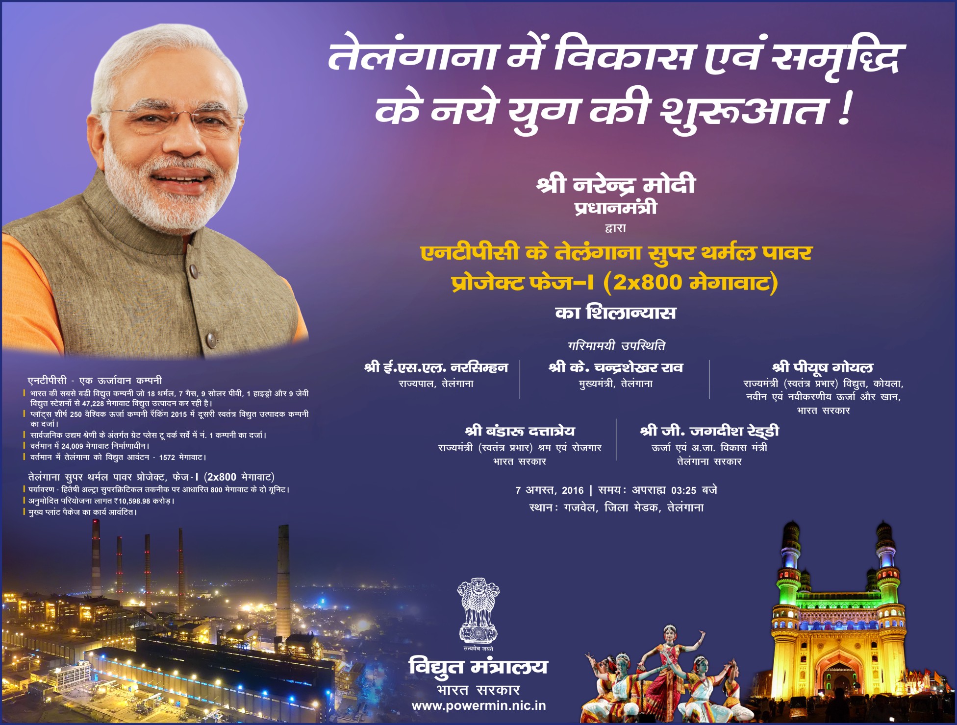 Advertisements Files Foundation Stone Laying Ceremony of NTPC'S Telangana Super Thermal Power Project Phase - 1 (2 X 800 MW) (Hindi) (555.9 KB) Media Publishing Date 2016-08-07
